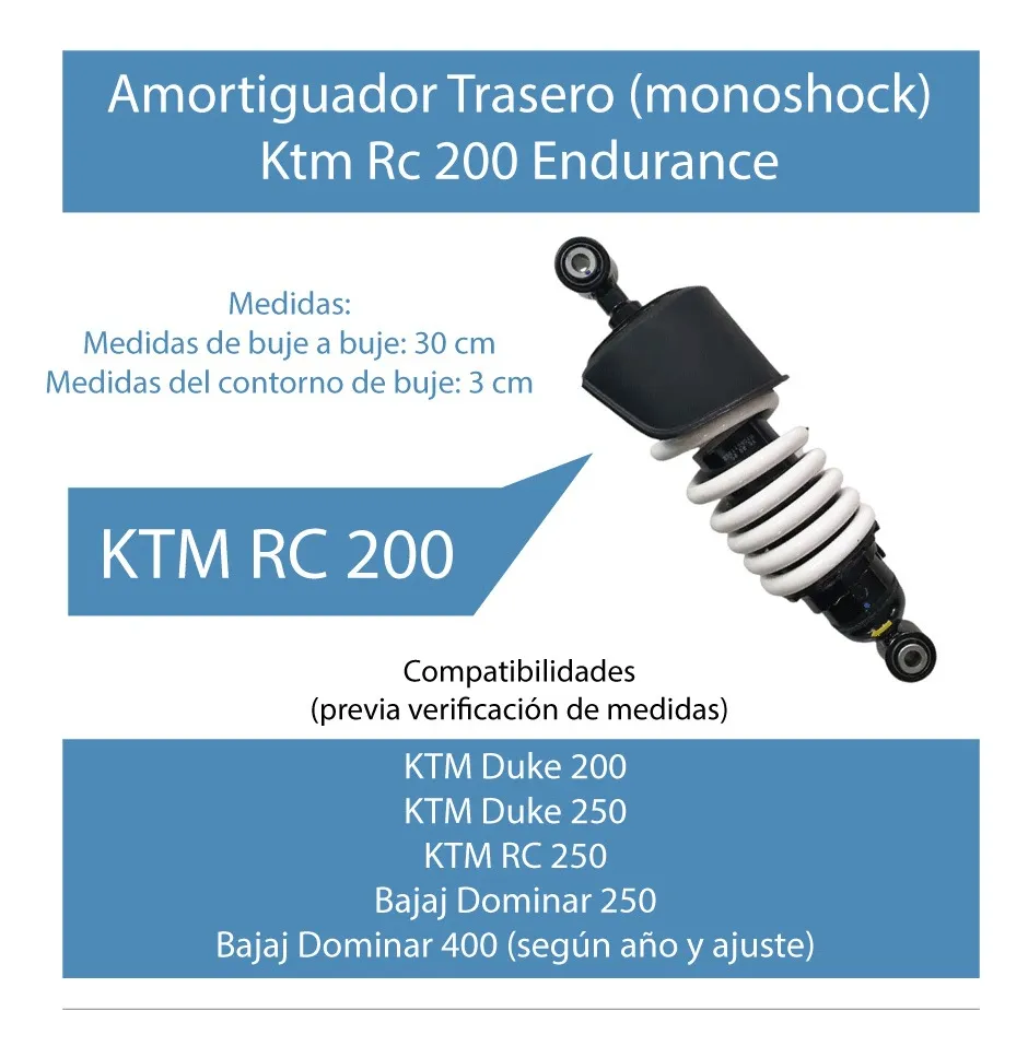 Amortiguador trasero tipo monoshock marca Endurance, diseñado para motocicletas KTM RC 200. También puede ser compatible con otros modelos que utilicen un sistema de suspensión similar y compartan dimensiones de montaje.
