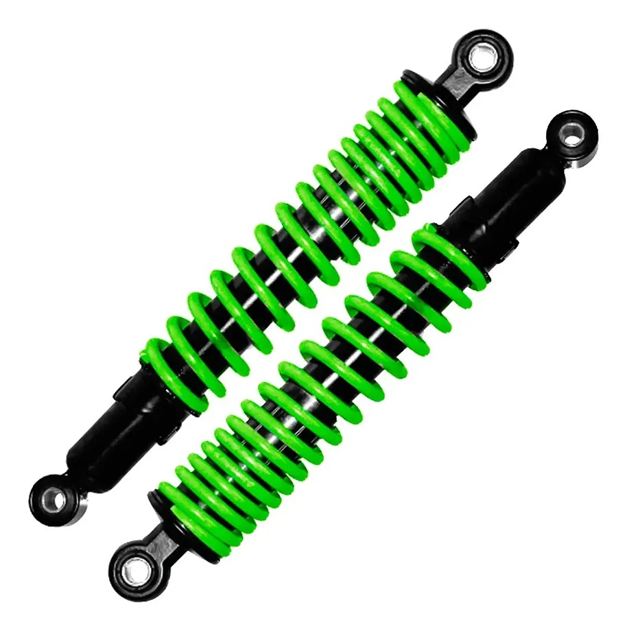 Par de amortiguadores traseros color verde, marca Hanzo, diseñados principalmente para la Italika 150Z. Ofrecen una mejora notable en la estabilidad y el confort de conducción. También pueden ser compatibles con otros modelos que compartan sistema de suspensión y dimensiones similares.